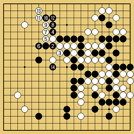黒2以下は実戦の進行です。依田九段は一向に中央に手を戻しません。黒14と急所に打たれると白に生きはありませんが予定の行動です。