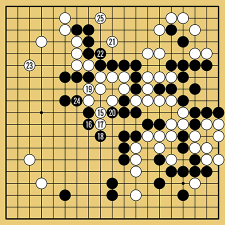 続いて白15から19と手数を伸ばしてから、白21が急所です。白25まで、周囲で得をしながら攻め取りにさせるのが白の狙いでした。