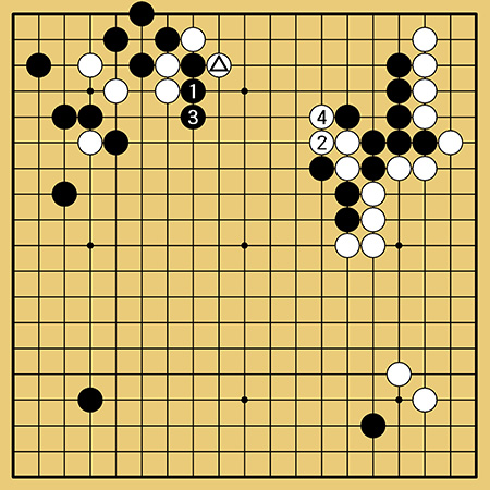 △に対して黒1と逃げるのは白2とこちらのシチョウを逃げ出すことができます。お互いにシチョウを逃げ出しこの先も難解になりそうです。