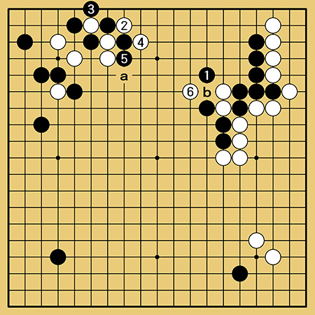 ちなみに3図の黒6で1とゲタで取るのも白2、4から白6のノゾキが好手。結局aのシチョウとbの逃げ出しが見合いになり白の注文通りです。