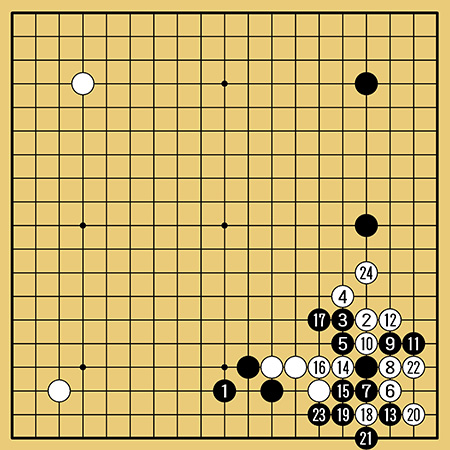 当時は黒1とカケツグのが最も普通の定石。対して白2から24まで三連星の模様を消すのが常識的でした。