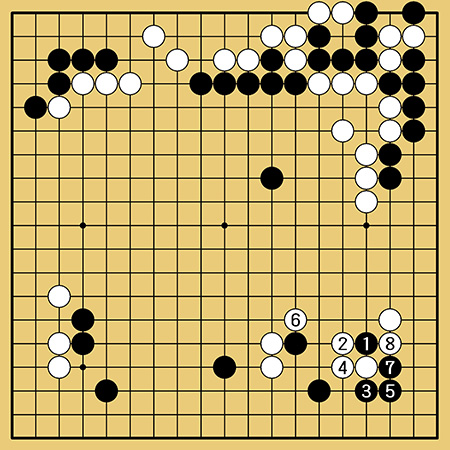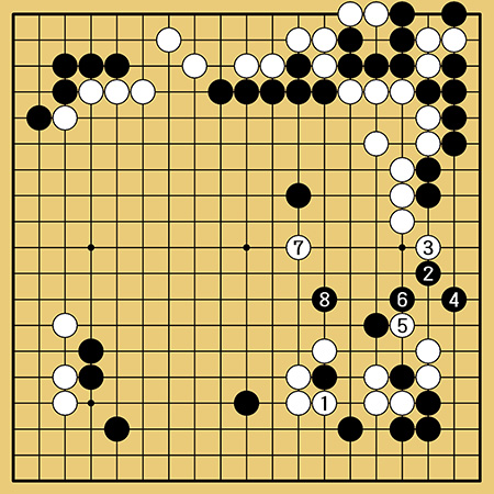 実戦は白1と反発したため、黒2から8まで、強く戦うことになり、難しいながらも少しペースを掴んだ感触がありました。