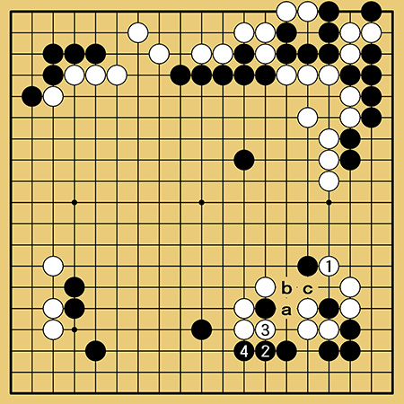 白1と受けてくれれば黒2、4と連絡する手が残ります。白3で4は黒a、白b、黒cで白がバラバラになります。