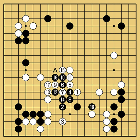 黒18でAと打てば脱出できますが、さらに厳しく追及して難しい戦いになりました。
