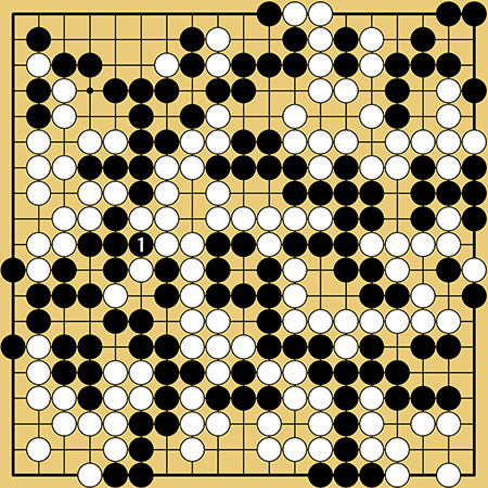 数秒後に石田九段により黒五子が抜かれました。のけぞる中野九段がつらそうだったのを覚えています。ここを取られてしまうと左下の黒の一団も全て死んでしまいます。