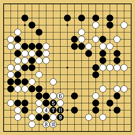 続いて白が4と二子を取りにくれば黒5から7と調子で出ていき、黒11までいつの間にか繋がる事が出来ます。