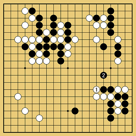 1図の黒2では本図の黒1と打つのも考えられました。ただし白4まで先手を取って白6などの大場に回れば「白がやれる」という判断で両者一致していたようです。