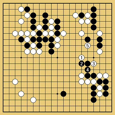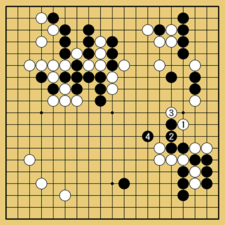 前図の白1と黒2の交換をせずに白1と形の急所に打つのは、黒4と良い形で逃げられて今ひとつです。