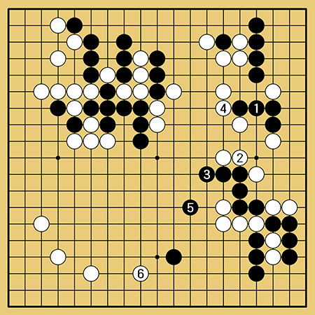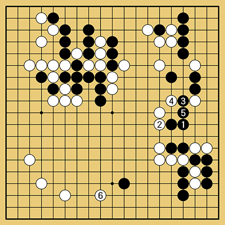 4図の黒1で本図の黒1と受けるのは白4のオサエがぴったり。右辺と上辺の白がきれいに連絡して白満足です。