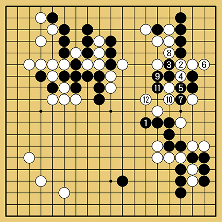 1図に続いて黒1と頑張ると白2、4の逃げ出しが成立します。白10から12が好手で――、