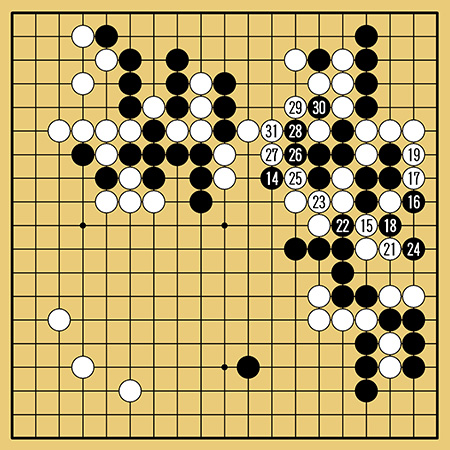 左辺の白模様の谷が深く、やや白が打ちやすい局面です。右辺の白をどうさばくか難しいところかと思われましたが……