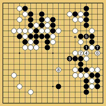 実戦は1図に続いて黒1と変化しましたが、黒5まではやむを得ず前図と似た進行になりました。白6ではaとオサえているのも考えられましたが、白6、8とさらに頑張り険しい戦いになりました。