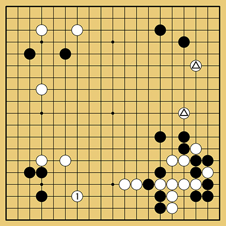 白1とひらいた局面です。盤面は広いですが、右辺△の白石に対しなにか打ってみたいところです。