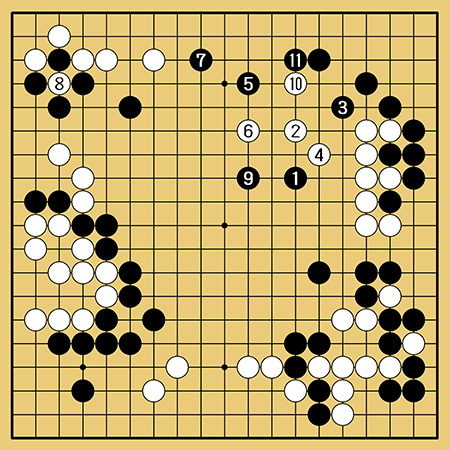 黒1から11まで白に寄り付いていきます。テーマ図の「この一手」から連動した石運びに秀行先生の雄大な構想力を感じ、このように打てたらと思いながら並べていました。