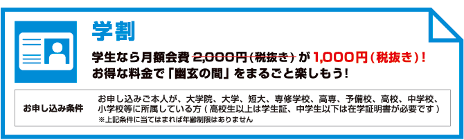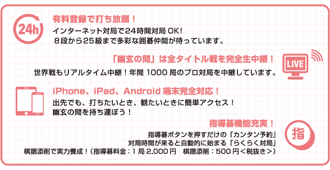 日本棋院ネット対局「 幽玄の間」 では2014年4月よりお得な料金でご利用いただけるサービスを開始しております。