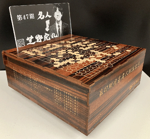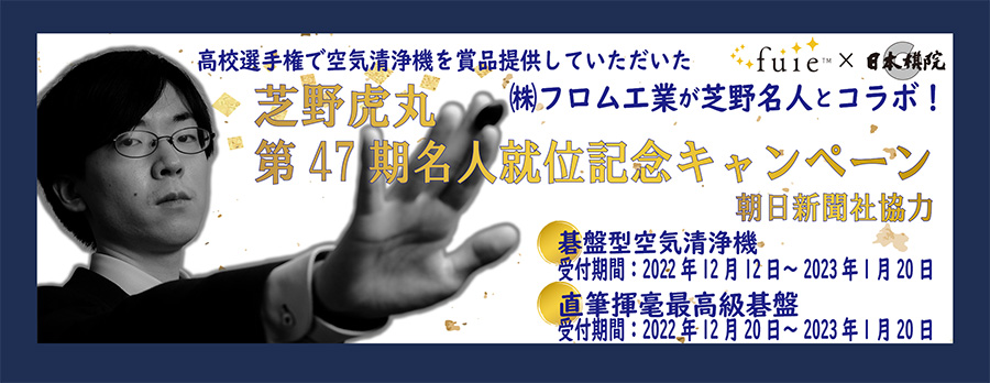 高校選手権で空気清浄機を賞品提供していただいた(株)フロム工業が第47期名人戦第7局の終局図型の空気清浄機を期間限定で受注生産いたします。光るプレートには芝野名人の揮毫が刻印されます。
