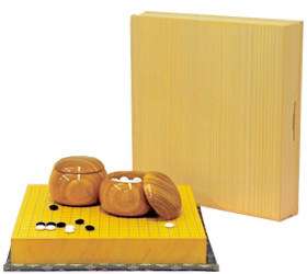「新風神セット」は香、打ち味ともに最高級の榧版に、美しい蛤(はまぐり)碁石、ケヤキ材の碁笥をセットにした一生もの。