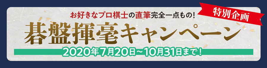 キャンペーン期間中に「榧(かや)二寸接盤・新風神セット」または碁盤を含む15万円(税込・一度の合計)以上の囲碁用品を日本棋院東京本院、もしくは日本棋院オンラインショップにてお買い上げのお客様に、日本棋院所属棋士が碁盤の裏面に直筆揮毫を入れてお届けいたします。