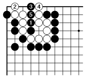 黒1(C)が正解。 黒5まで押す手なしで白死。 黒1に対して白が5と応じても、黒から2または4にハネれば一線に白の眼が出来ず白死。白2で4は、黒2で白死。 |