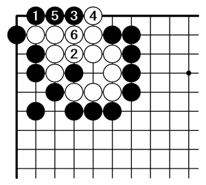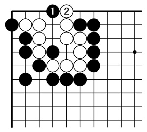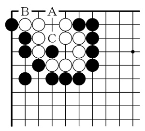 黒1(A)は白2が絶対で、白2のあと黒に攻め手がありません。 |