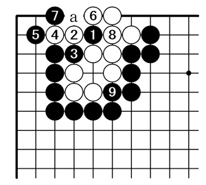 黒1(B)が正解。白2には黒3以下、黒9まで白死。白4で9の眼持ちは、黒aと一子をカカえられて一眼。 |