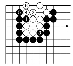黒1(A)には白2が好手。 黒3と目を奪っても、白4以下6まで上辺に2眼を持たれて白生き。 |