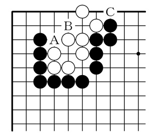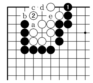 黒1(C)は失敗。白はすでに中央部に一眼持っている格好なので、黒1には白2で白生き。 黒1に白aは、黒bのサガリが好手。続いて白2、黒c、白d、黒eで眼がなくなります。 |