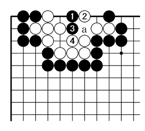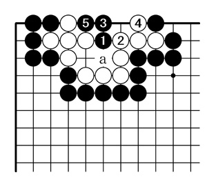 黒1(A)が正解。白2に黒3のサガリで白は窮し、以後黒5まで白死。なお正解の手順中、黒がうっかり黒5を手抜きすると、白からaにオサエられ、セキになってしまいます。 |