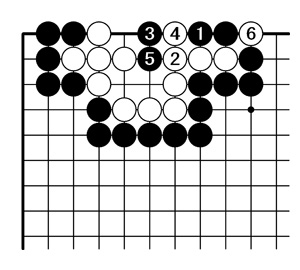 黒1(B)は白2とワタリを止められ、黒3と眼をつぶしても、白4で黒に後続手段がありません。白2でaのツギは、黒3で正解図に戻ります。 |