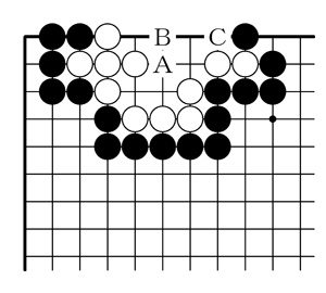 黒1(C)は白のキズをつながせてしまう味消しの一手。白2とツガれて、以下白6まで白生き。なお白2では3にコスんでも白生きです。 |
