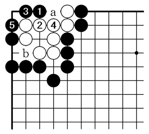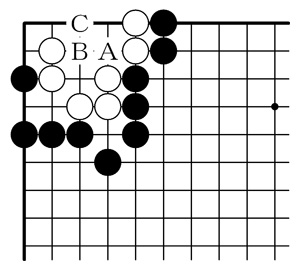 黒1(C)から黒5まで白死。 白が2で3とさえぎってきても、黒2と応じれば白に2眼は出来ません。なお黒1、白3の時黒4では軽率で、白2、黒a、白bと一転して白生きに。 |