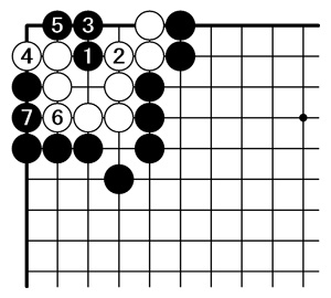黒1(B)は黒7まで、セキで生きられてしまっては失敗。 |
