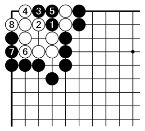 黒1(A)と白2子を噛み取っても、黒3以下白8まで生きられて失敗。白4で6のツギには、慌てず黒4、白7、黒8で白死。 |