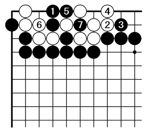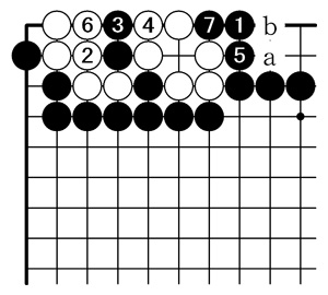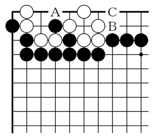 黒1(C)以下黒7まで白死。 白2で5と出ても黒a、白2、黒3、白4、黒b、白6、黒7まで。 |