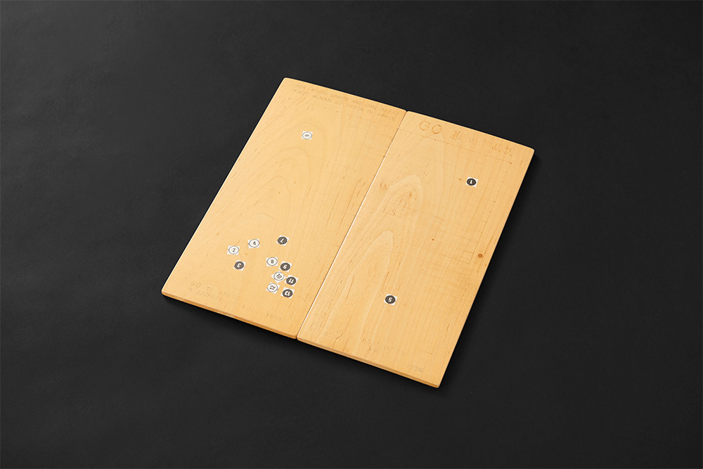 スペースシャトル「エンデバー」で、宇宙飛行士の若田光一さんとダニエル・バリーさんの囲碁の対局が行われたがその時に使われた碁盤。無重力なので、石の代わりにシールを貼るものだった。