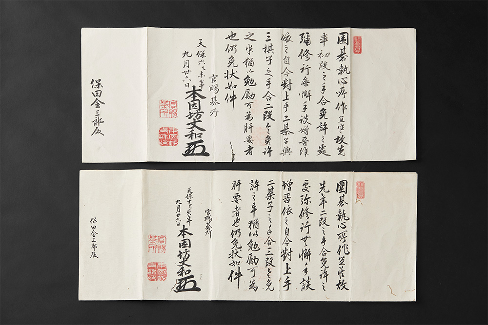 江戸時代は「名人碁所」が免状の発行権を保持していた。江戸を通じてその地位に就いたのは6人しかいないが、その中の一人、本因坊丈和(天明7(1787)年-弘化4(1847)年の署名入りで発行されたものである。現代の免状と同じ大高檀紙に書かれている。