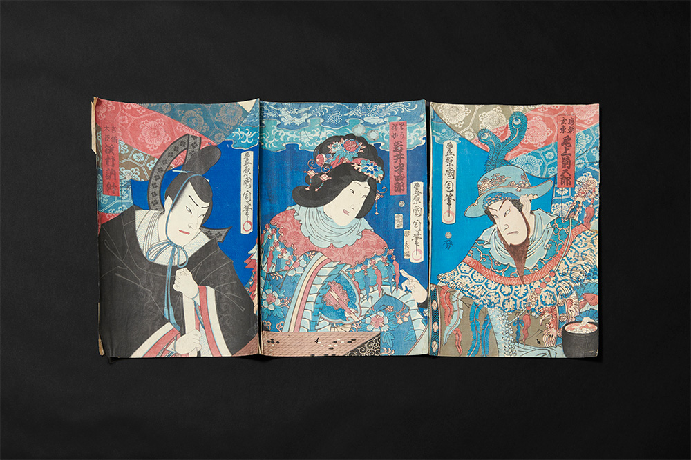 幕末から明治にかけての浮世絵師豊原国周(天保6(1835)年-明治33(1900)年)作の大判錦絵。吉備真備が唐に留学したときに大臣玄東と対局したという伝説を元に、脚色され明治6年に上演された歌舞伎に取材。吉備真備は長らく囲碁を日本に伝えた人だと伝承されてきた。 日本棋院 蔵