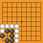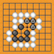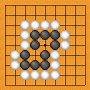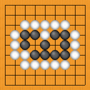 呼吸点の1個1個が黒石で完全に囲まれてブロックされていて、地のスペースが二つにハッキリ分けられ二眼(にがん)あれば、最小の生き形です。 石の「生き死に」を比較してみましょう。