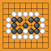 黒生きの問題です。あと黒が一手打てば生きます。 黒はどこに打ちますか?マウスをつかって、クリックしてください。 正解すると、自動で次の問題にいきます。(1問〜20問) 回答しないで次の問題に進むときは「次へ進む」から進んでください。 前へ戻る 次へ進む
