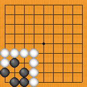 黒生きの問題です。あと黒が一手打てば生きます。 黒はどこに打ちますか?マウスをつかって、クリックしてください。 正解すると、自動で次の問題にいきます。(1問〜20問) 回答しないで次の問題に進むときは「次へ進む」から進んでください。 前へ戻る 次へ進む