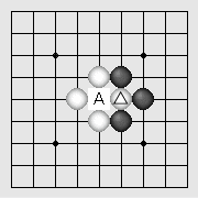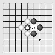 そうすると今度は黒△がアタリとなり、白は先ほどの白△のところ(図08)Aへ打てばまた黒△を取ることができますが、それでは黒白の取りっこが永遠に続くことになり、いつまでも終りません。この形をコウといいます。
