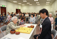 公開激励対局として連碁を行い、福島県内の女流アマ8名がプロ棋士チームに5子で挑戦した。女流チームは、小学生・中学生3人、主婦4人(うつくしま碁友会、郡山レディース会)そして93歳の出浦のぶ代さんと、県内から幅広く集めたメンバー。結果は、5子のハンディと山田規三生女流チーム総監督の適切なアドバイスで、女流チームの完勝。 |