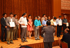 23日の「あえりあ遠野」には、被災地区も含め岩手県全体から100数十名が参加された。公開激励対局では、津波で大きな被害を出した7地区の支部選抜者とプロ棋士が対局した。そして、交流会の場でプロ棋士からそれぞれの対局相手に色紙が贈られた。100面打ちには90名の方に参加して頂いた。 |